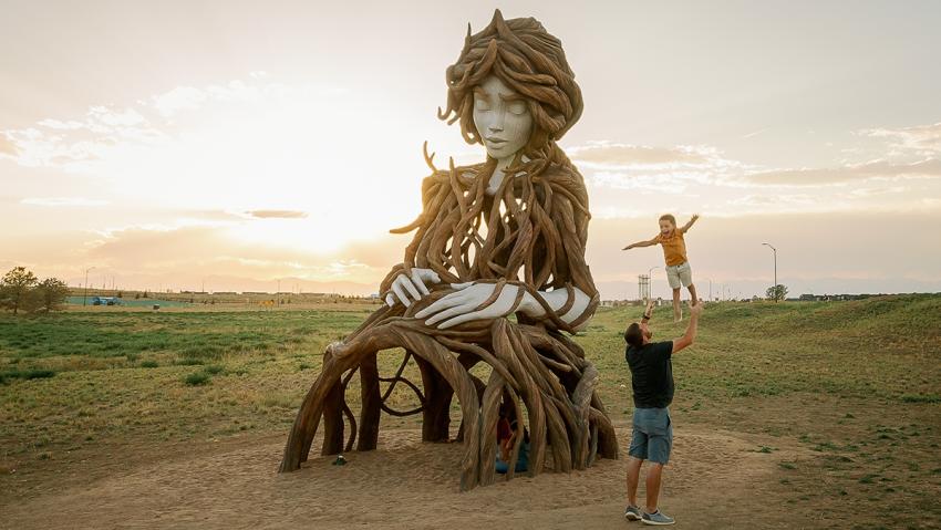 The Brainchild of artist Daniel Popper, Umi is a captivating giant female figure emerging from the earth, symbolizing the interconnectedness of humanity with nature. This monumental sculpture, standing tall amidst the landscape, evokes a sense of awe and reverence, inviting viewers to contemplate their relationship with the environment. With intricate details and graceful curves, Umi embodies the spirit of the natural world, reminding us of our responsibility to protect and cherish the planet we call home. Visit Umi at The Aurora Highlands. Learn more about Umi here. Directions here.