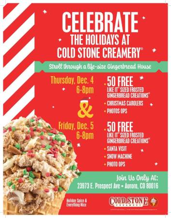 Come by the Aurora location where we will have FREE ICE CREAM to the first 50 people on Thursday and Friday who will get to try the limited-edition Frosted Gingerbread ice cream and Creation. Stroll through our Cold Stone store transformed into a Gingerbread House. Enjoy a cozy holiday atmosphere with a visit from Santa and sing along with Christmas carolers. Win fun branded Cold Stone merch. Capture fun, festive content with plenty of photo ops perfect for Instagram and TikTok!